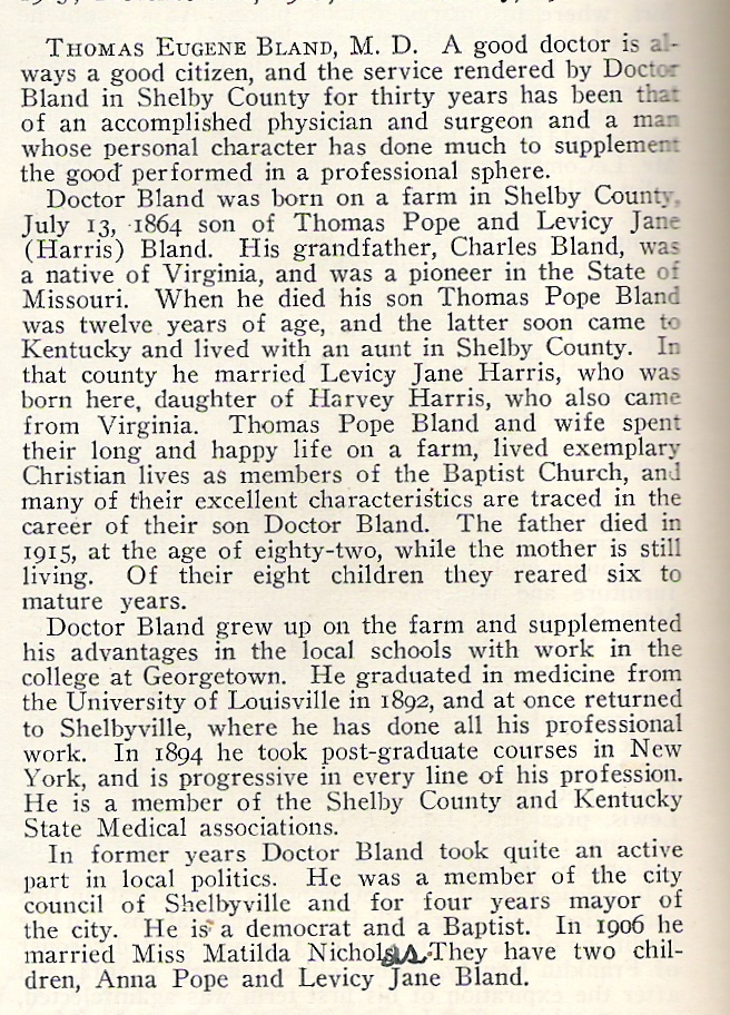 Dr. Thomas Eugene Bland was the son of Thomas Pope Bland (Bl4) and Levicy Jane Harris (Ha4).