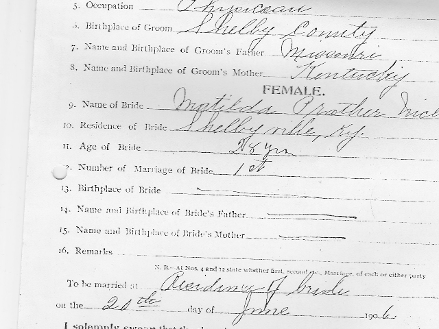 He married Matilda Prather Nicholas Ni3 on June 20, 1906, in the presence of Rev. Worden Nicholas Ni3-4, Patrick Pope Nicholas Ni3-7, George Nicholas Ni3-5, Lawrence Nicholas Ni3-9, Sarah Lawrence Nicholas Ni3-6, Mary Anna Nicholas Ni3-12, .