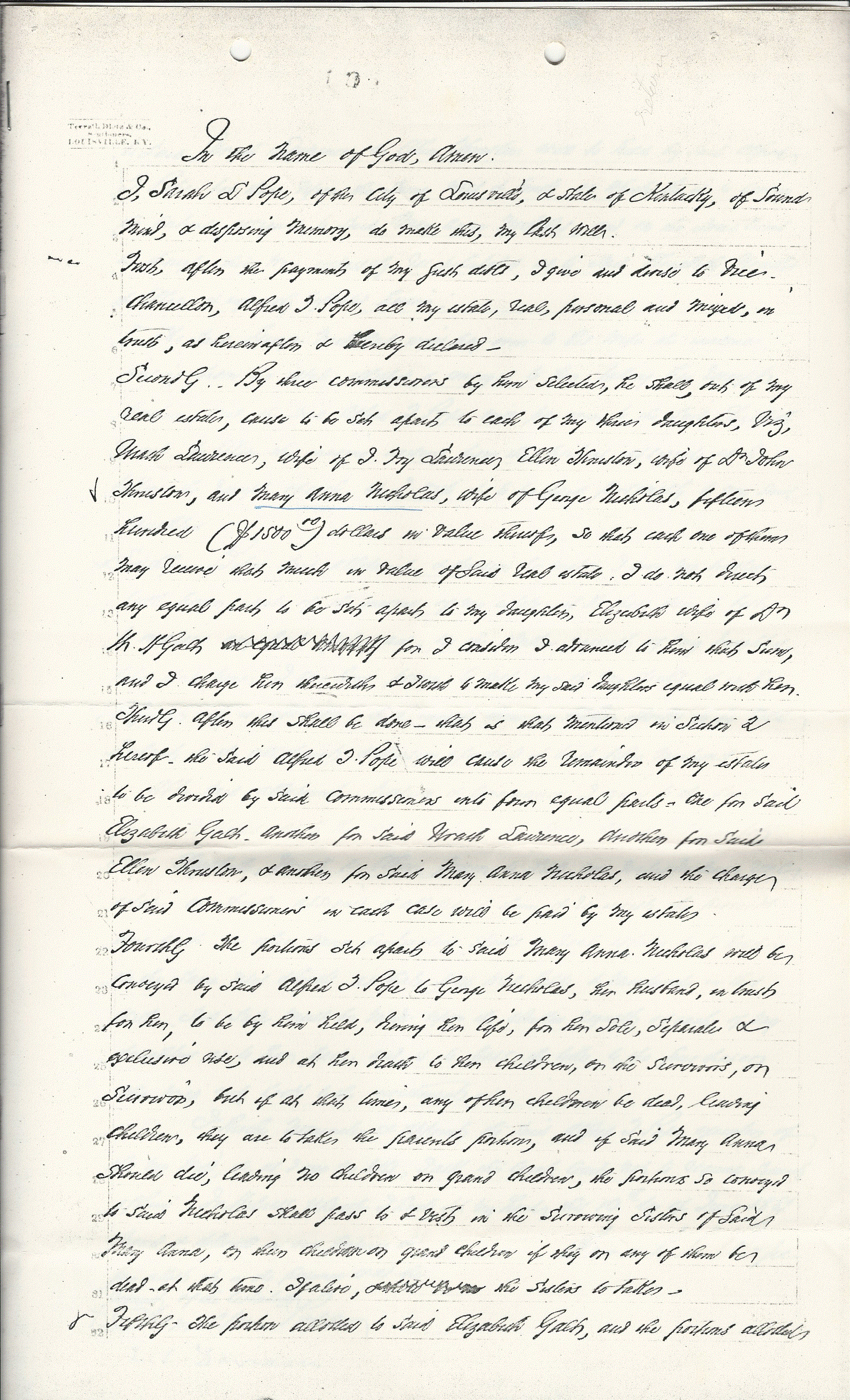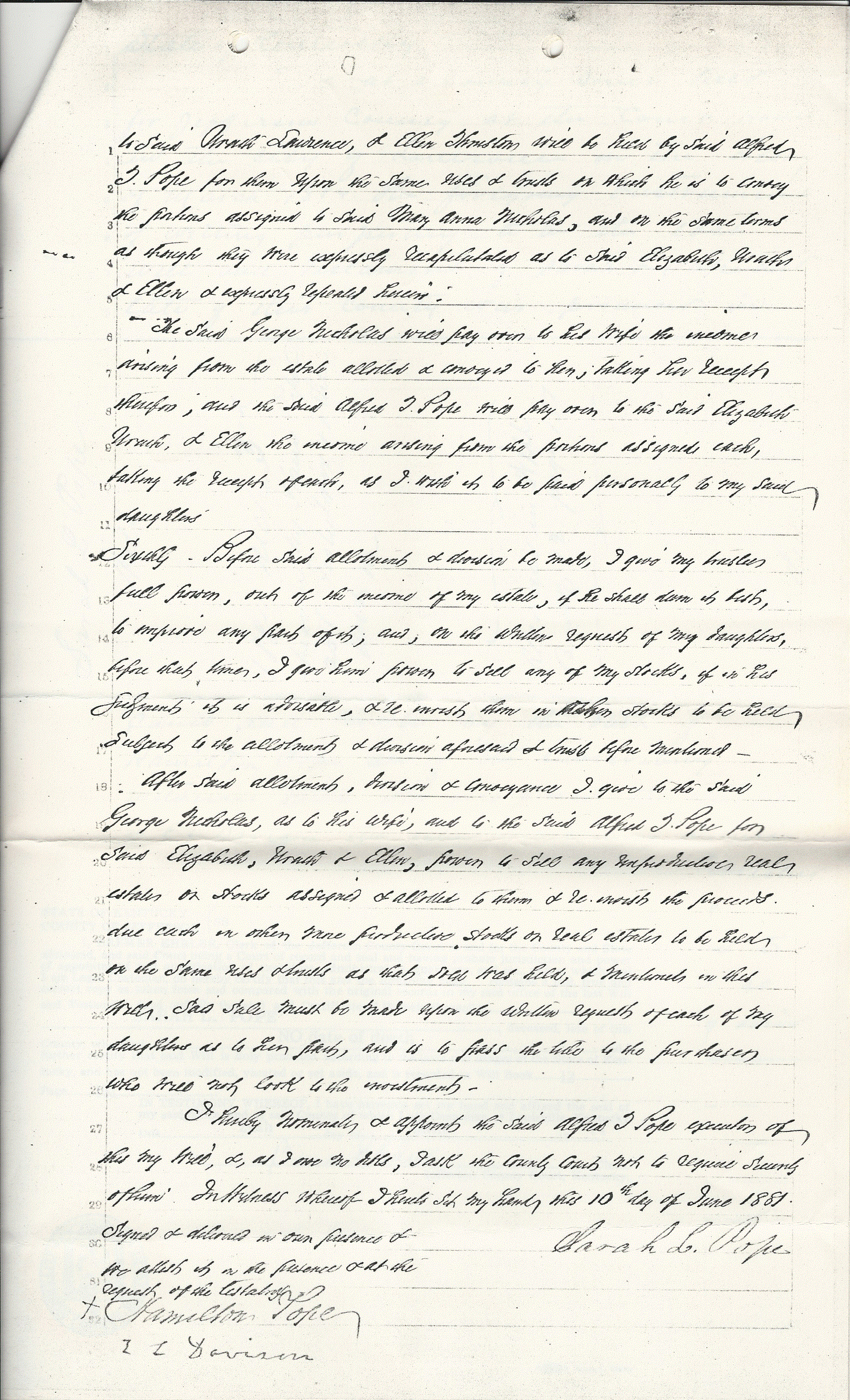 This certified will copy dated 1881 in the posession of William Hester (He1-2) names Vice Chancellor Alfred T. Pope as trustee and her three daughters, Urath, Ellen and Mary Anna, as equal beneficiaries. (Po4) Mary Anna Pope is named as Mary Anna Nicholas, wife of George Nicholas. The will is witnessed by her brother-in-law, (Po5-4) Hamilton Pope and