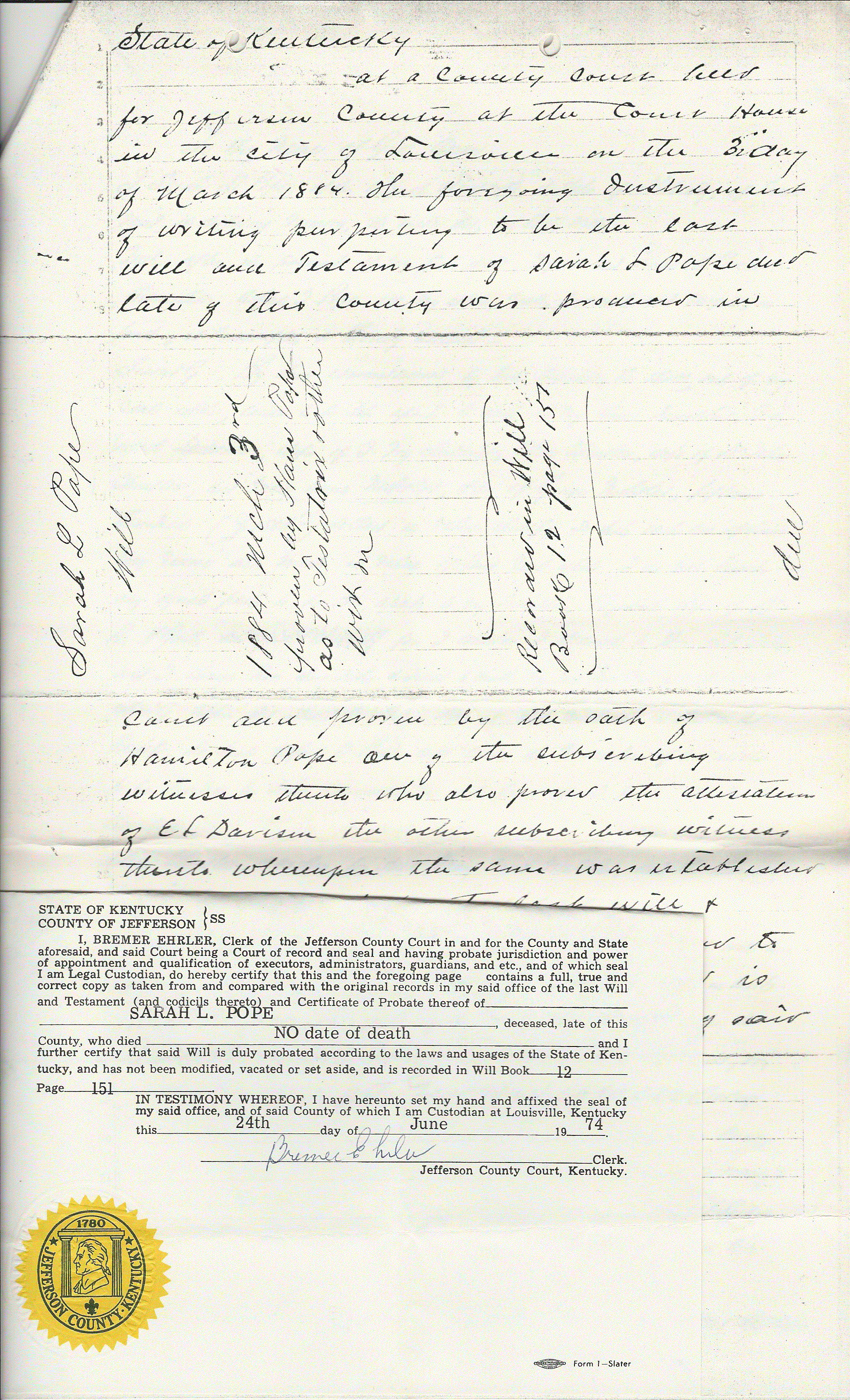 Sarah Lawrence Pope nee Brown�s Will in certified copy: