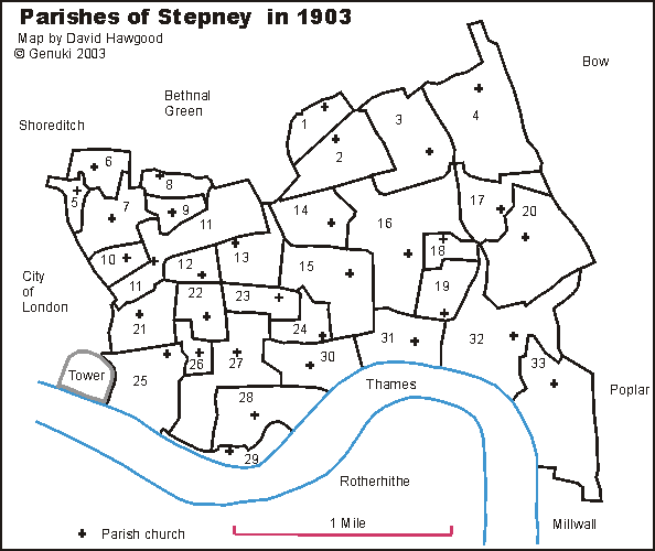 ![]() WHITECHAPEL, St. Mary, (St. Mary Matfelon)Whitechapel Road [out of Stepney in 1323] bombed, WW2, not rebuilt. 1951 parish divided between Spitalfields Christ Church with All Saints and Stepney St. Augustine w.S.Philip. see SAINT MARY, WHITECHAPEL, WHITECHAPEL HIGH STREET, TOWER HAMLETS for registers at LMA Parish is no. 11 |
