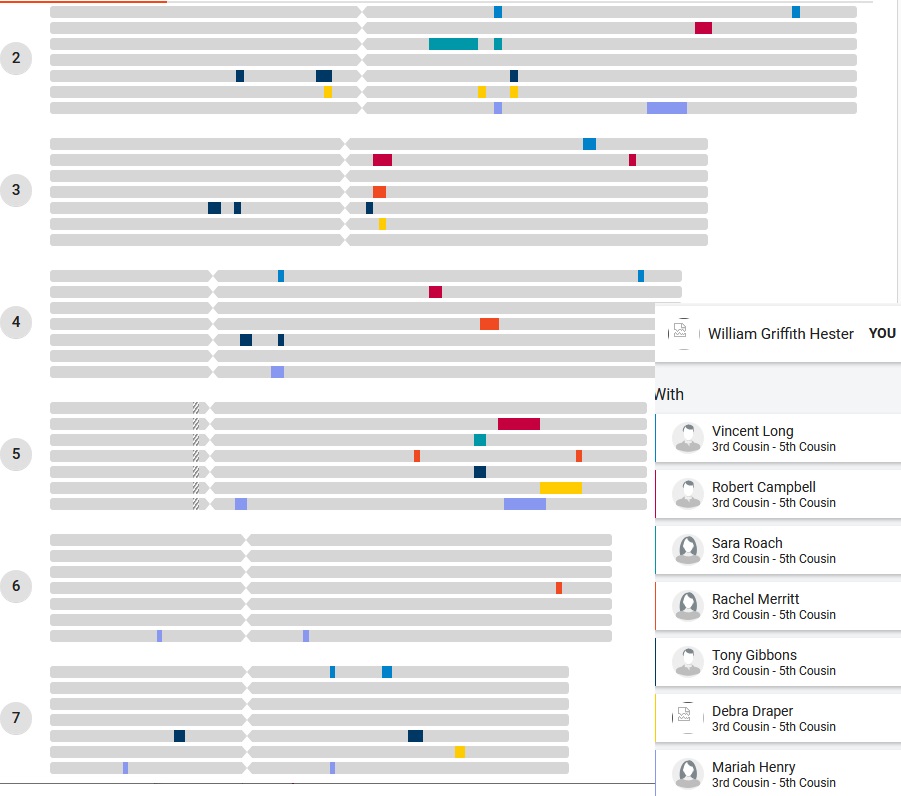List of pedigrees Bland of Northern Neck Va. Nicholas of Roundway Hester of Fleming Co Ky Thruston Author's DNA match comparisons gedmatch.com kit No. T848545 |
