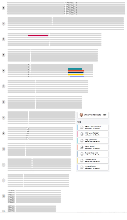 -1 Luke Randolph Chandler b 1808 d 1880 m Sarah Ann McFarland | -1-1 Francis Marion Chandler b 1835 d 1899 m Euphenia Skelton b 1846 d 1899 | -1-1-1 Robert Edward Chandler b 1877 m Nannie B Russell b 1879 d 1905 | -1-1-1-1 Nannie B Chandler b 1905 d 2001 m Woodford Owen Nelson b 1905 d 1968 son of Stephen Mae Nelson and Ellie Ethel Owen parents of Nancy Owen Nelson, author' 27 cM DNA Match with 18.7 cM segment on chr 1 range 111824209 to 154789036, 8 cM on chr 2 range 187240797 to 197482048 | |||||||||||||||||||||||||||||||||||||||||||||||||||||